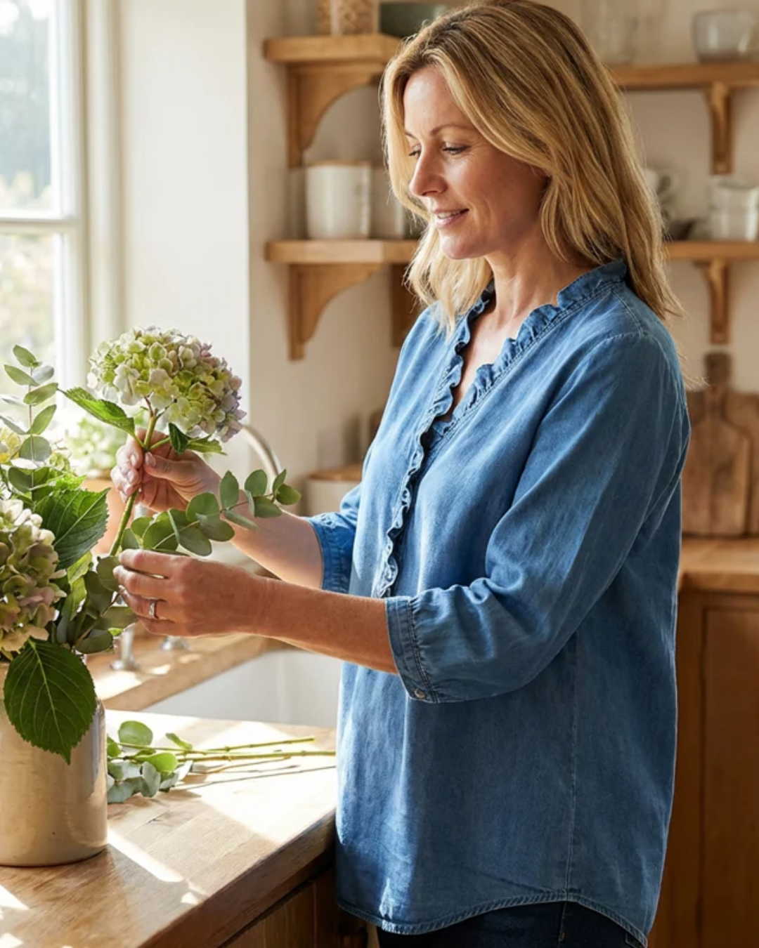 Possui mangas a três quartos que oferecem o equilíbrio perfeito entre cobertura e frescura. Este design é ideal para estações de transição, permitindo exibir acessórios nos pulsos e proporcionando uma funcionalidade prática para as atividades diárias sem sacrificar um estilo pessoal sofisticado.